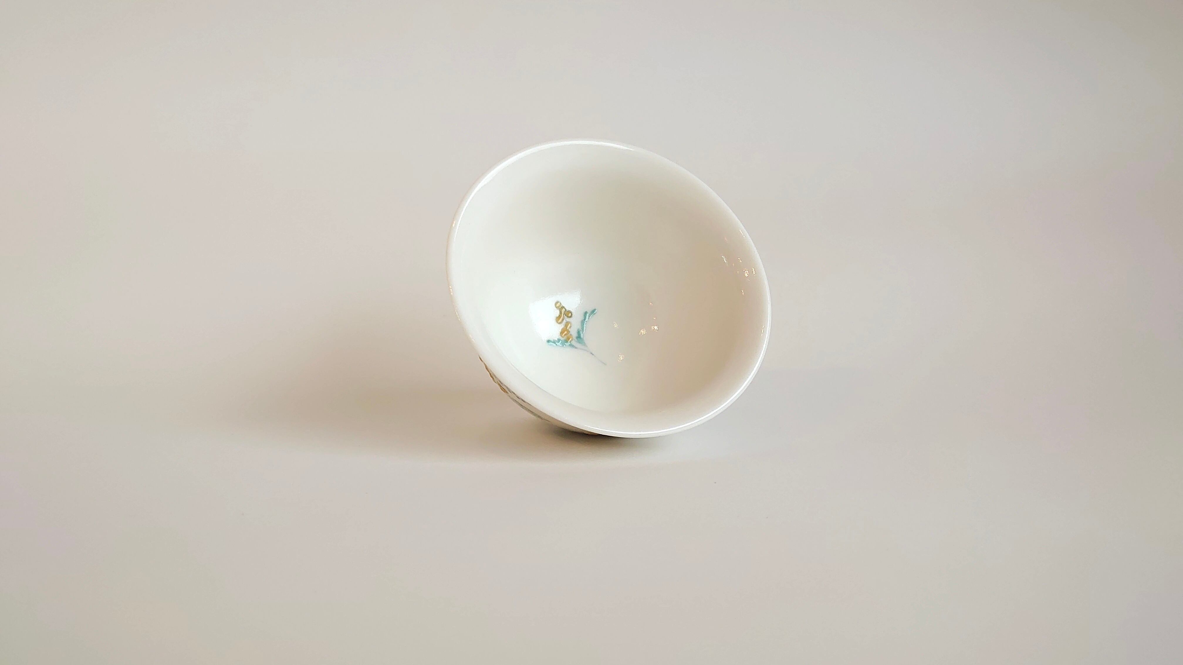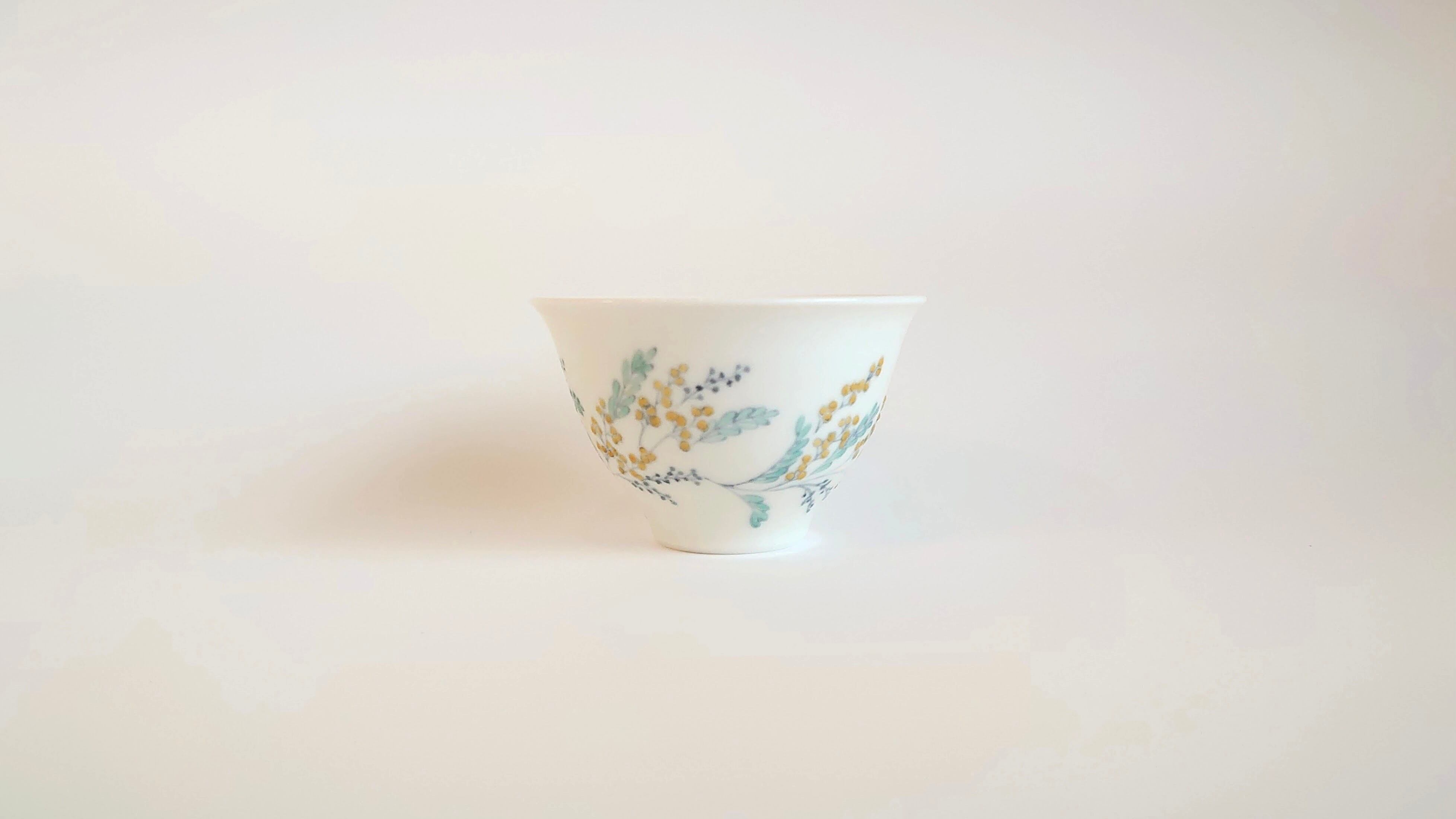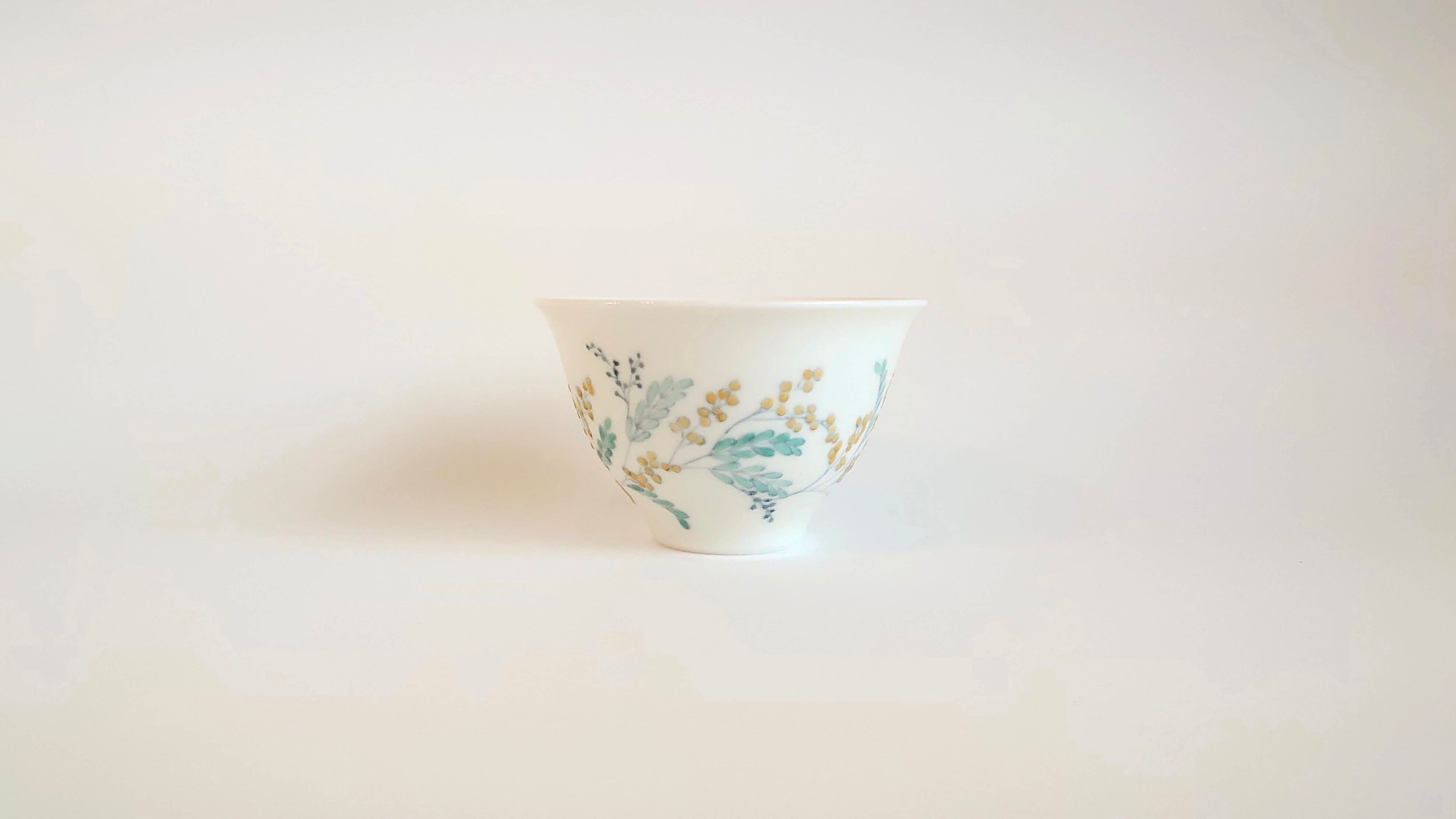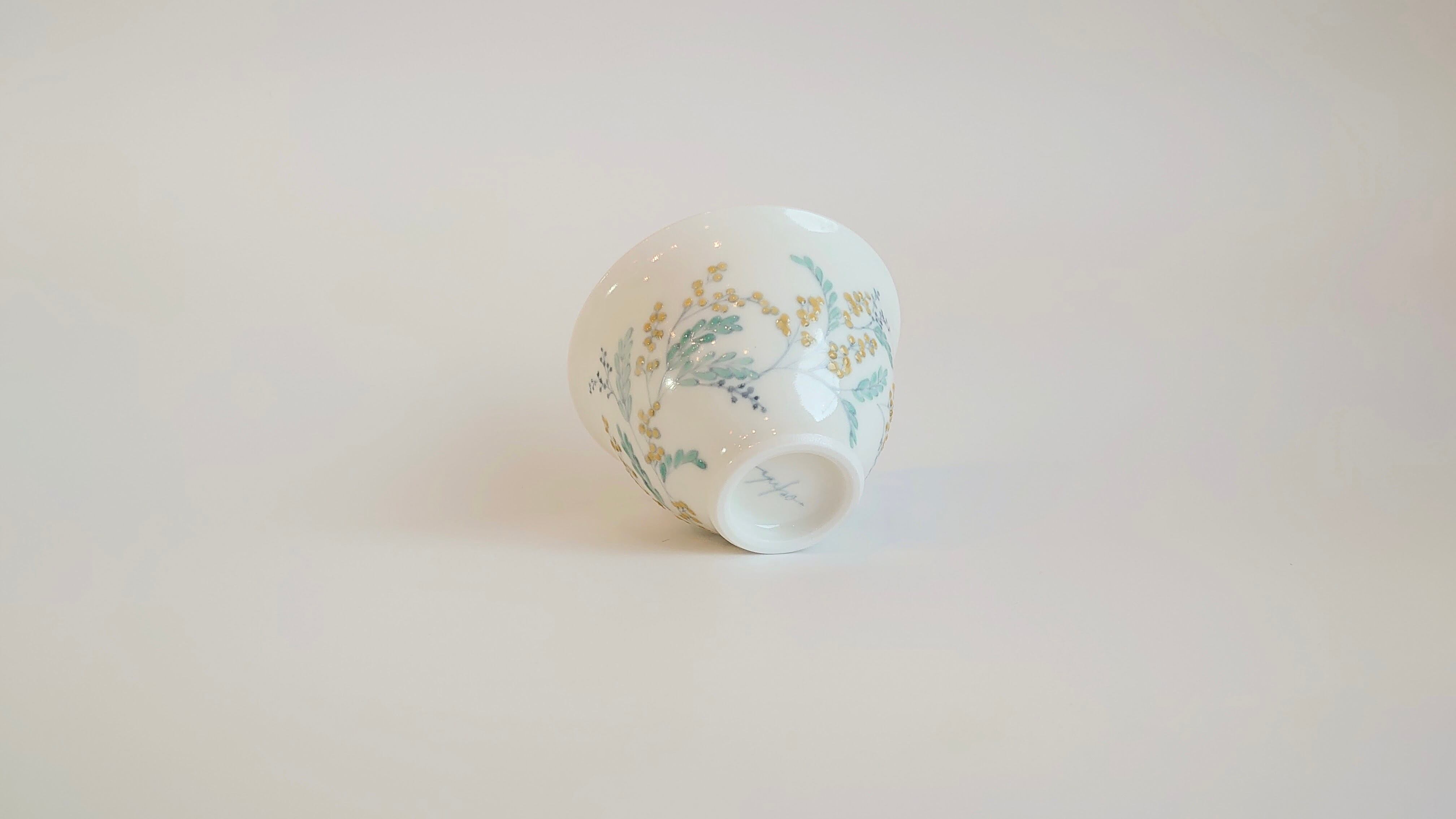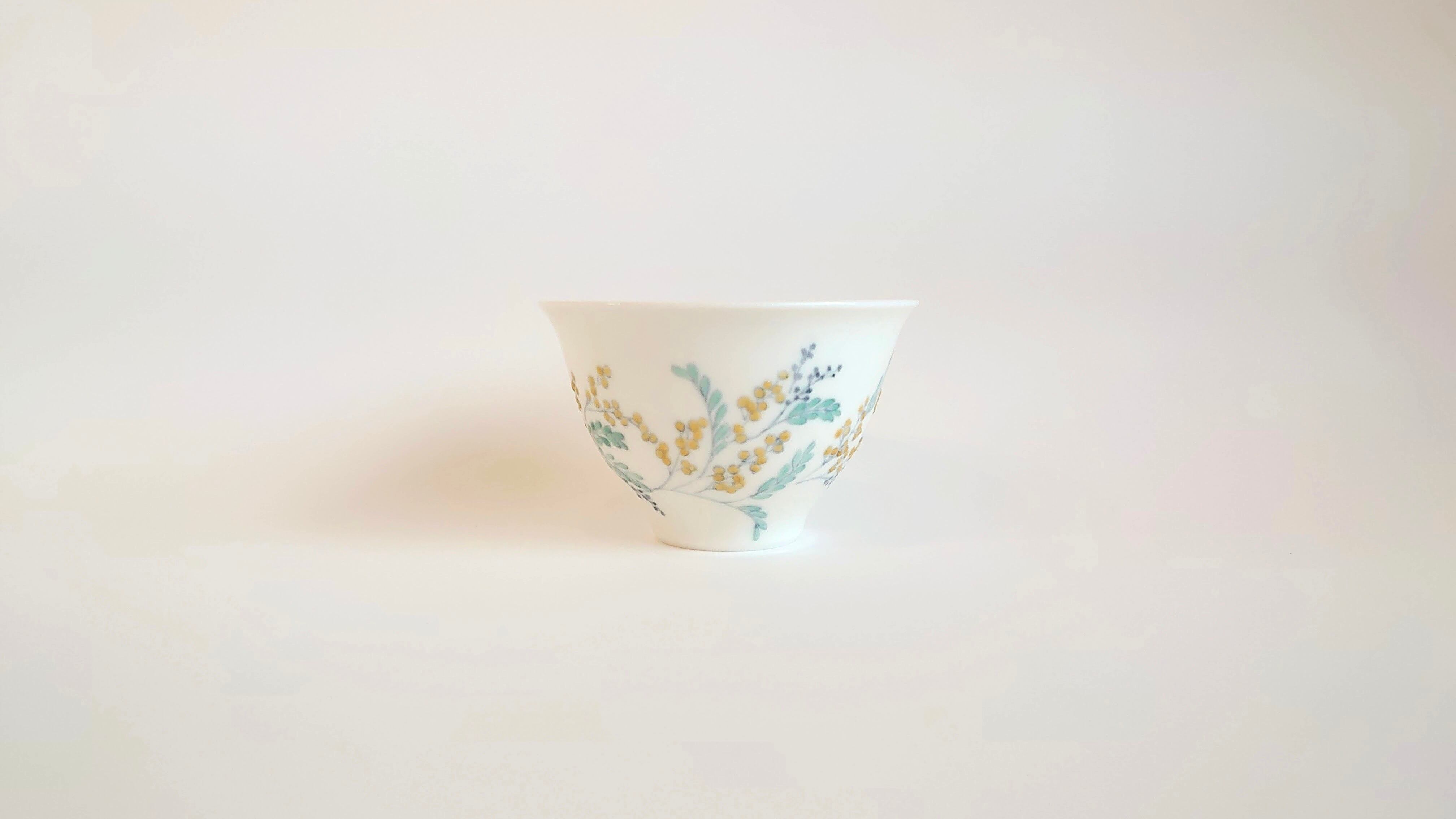 並べてみると揃いのものに見えますが、ひとつとして同じ文様はないミモザを施した盃です。