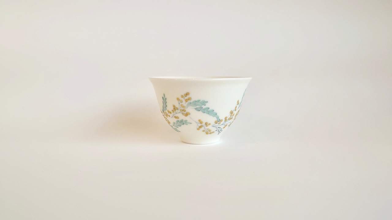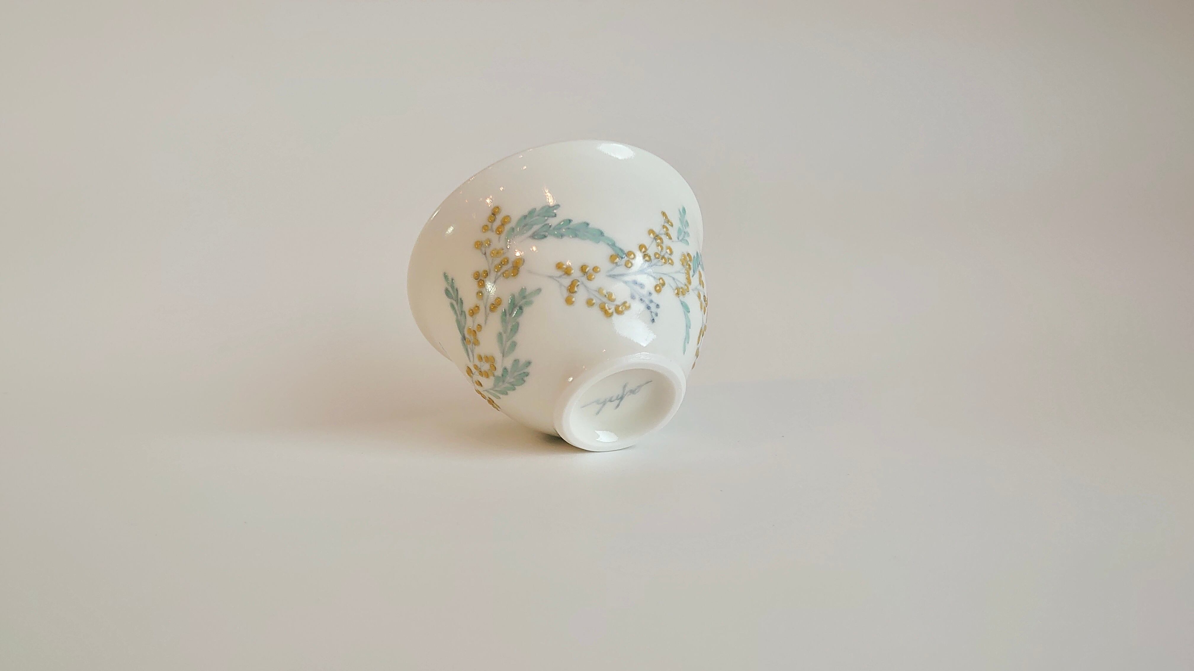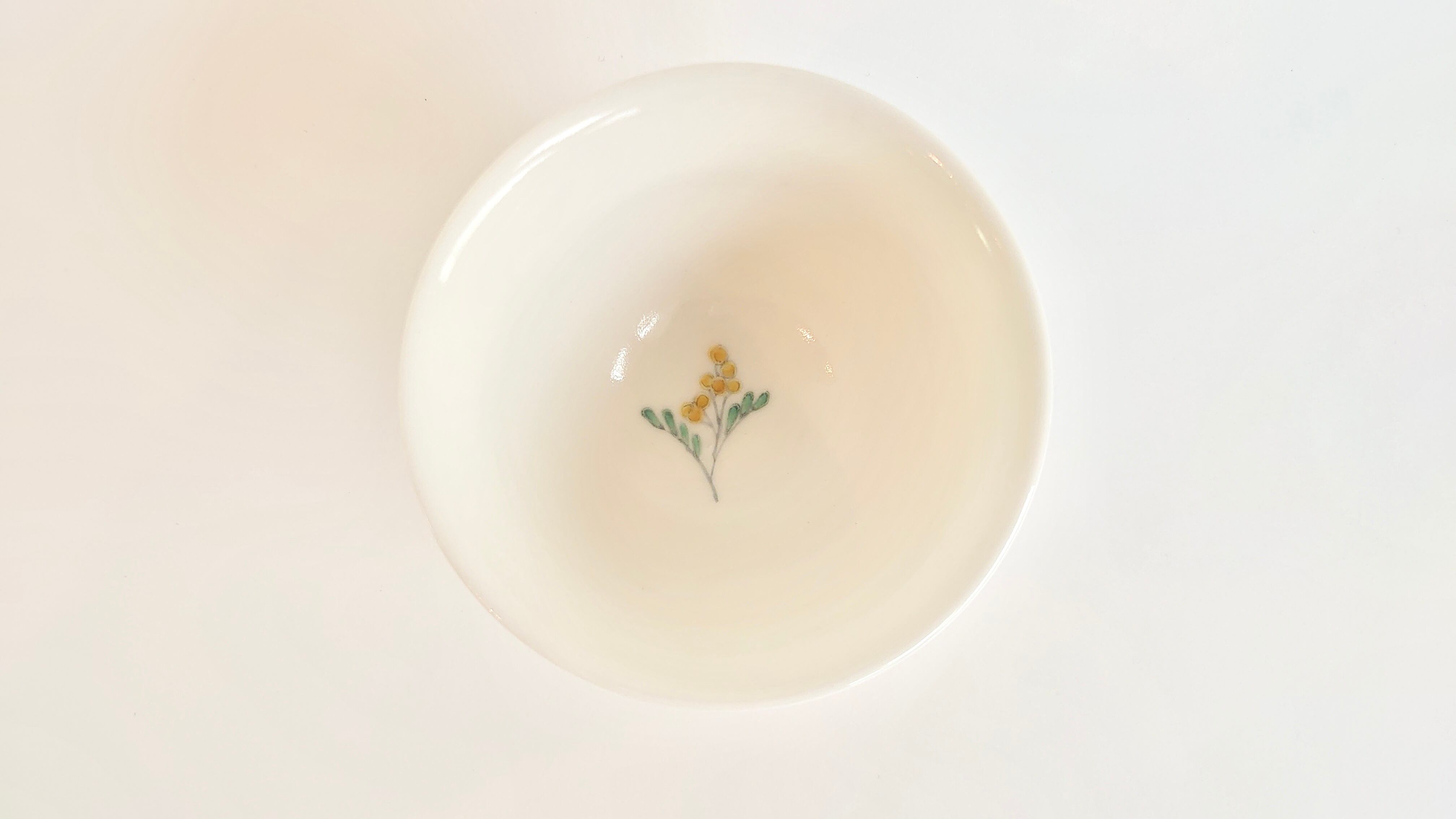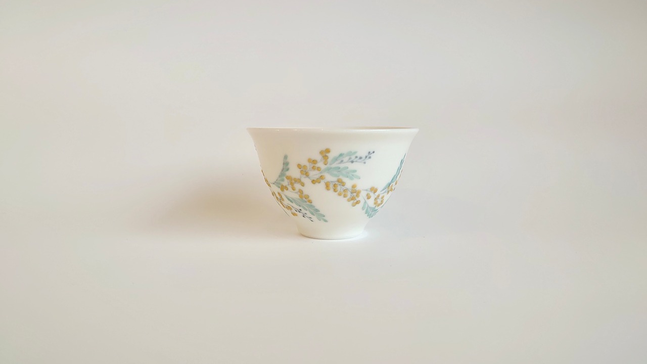 並べてみると揃いのものに見えますが、ひとつとして同じ文様はないミモザを施した盃です。