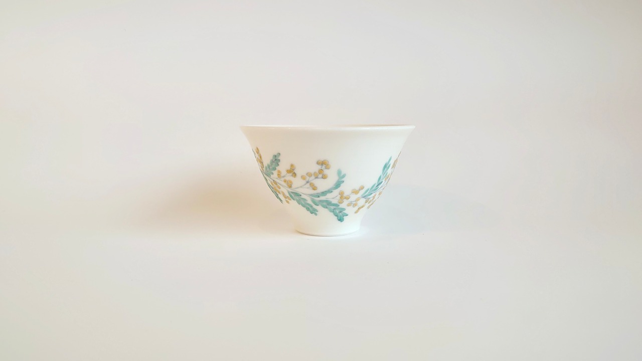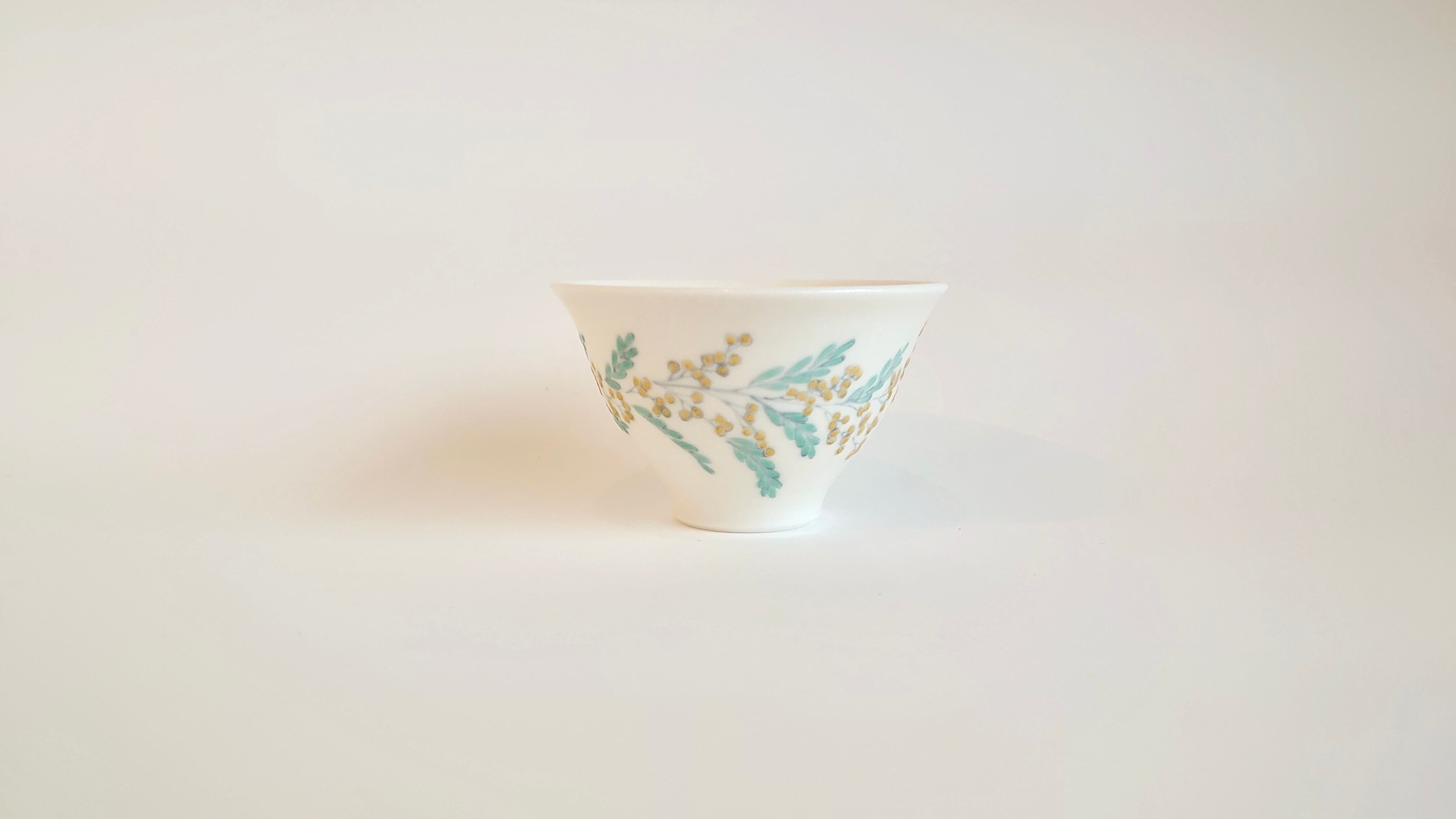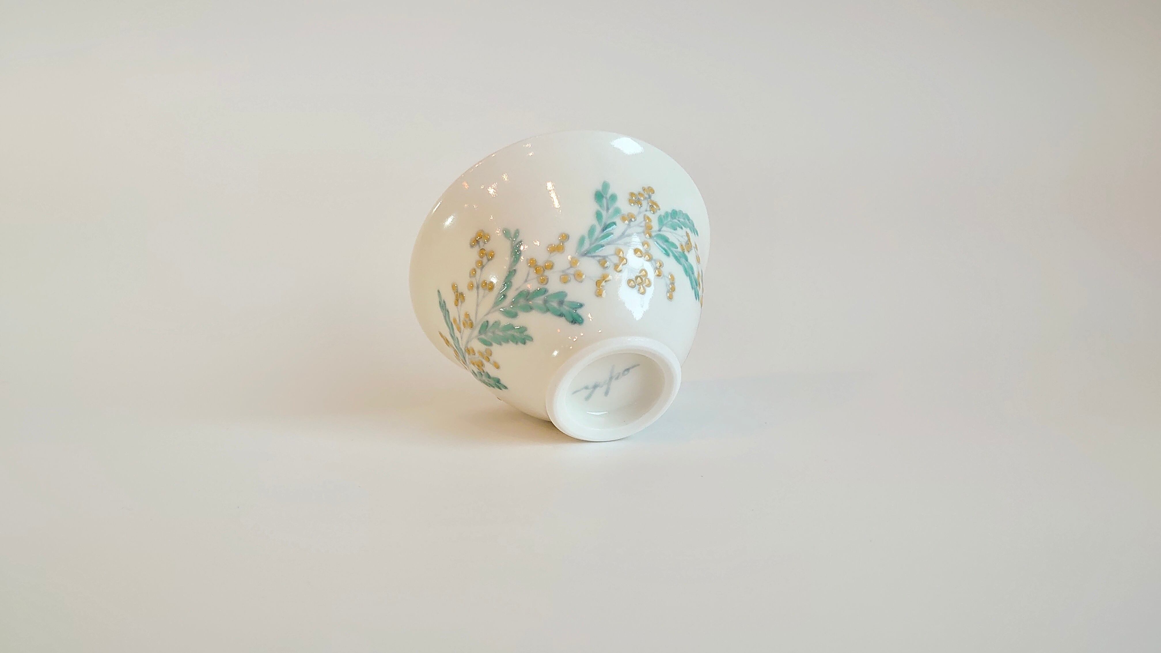 並べてみると揃いのものに見えますが、ひとつとして同じ文様はないミモザを施した盃です。