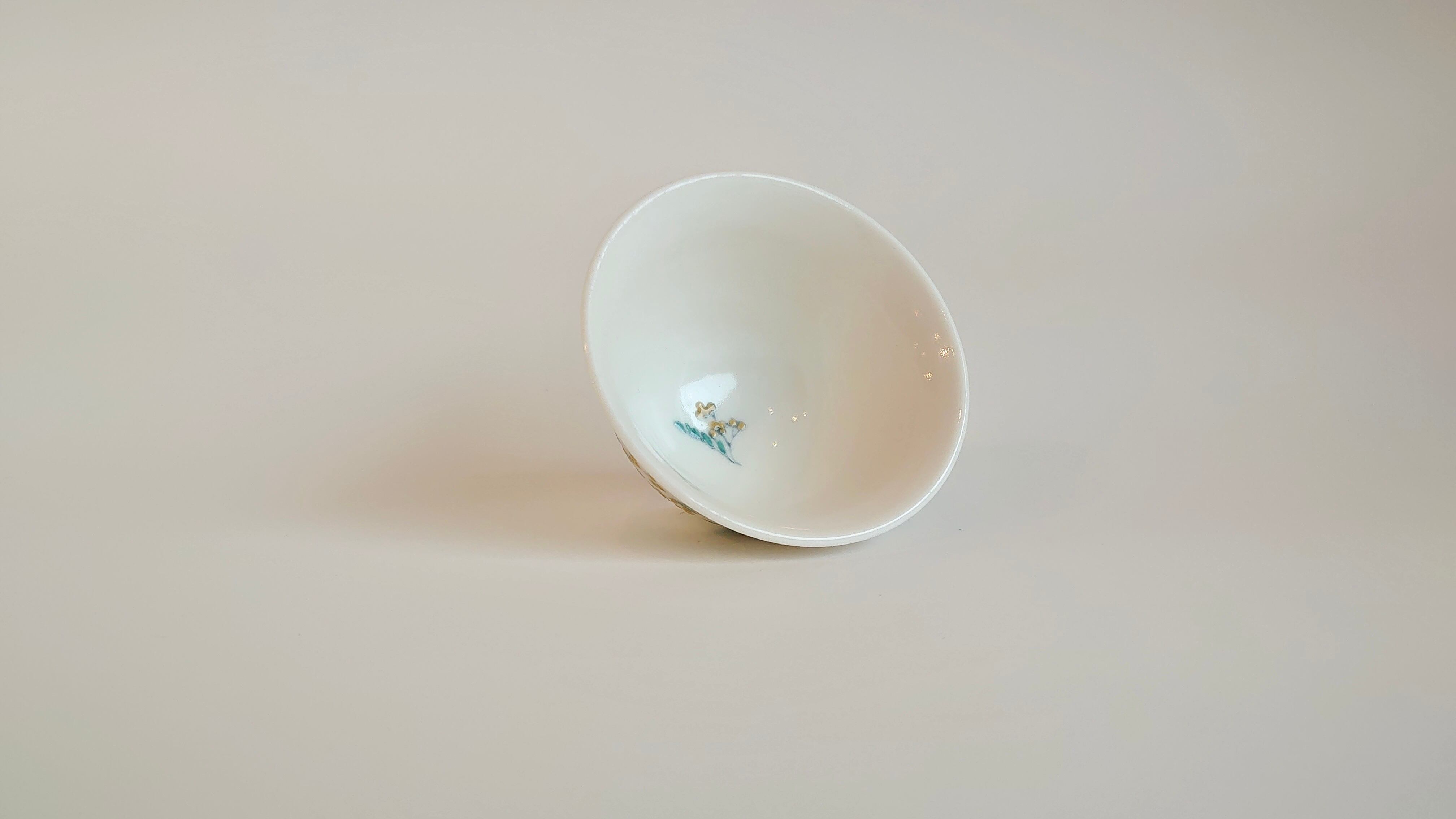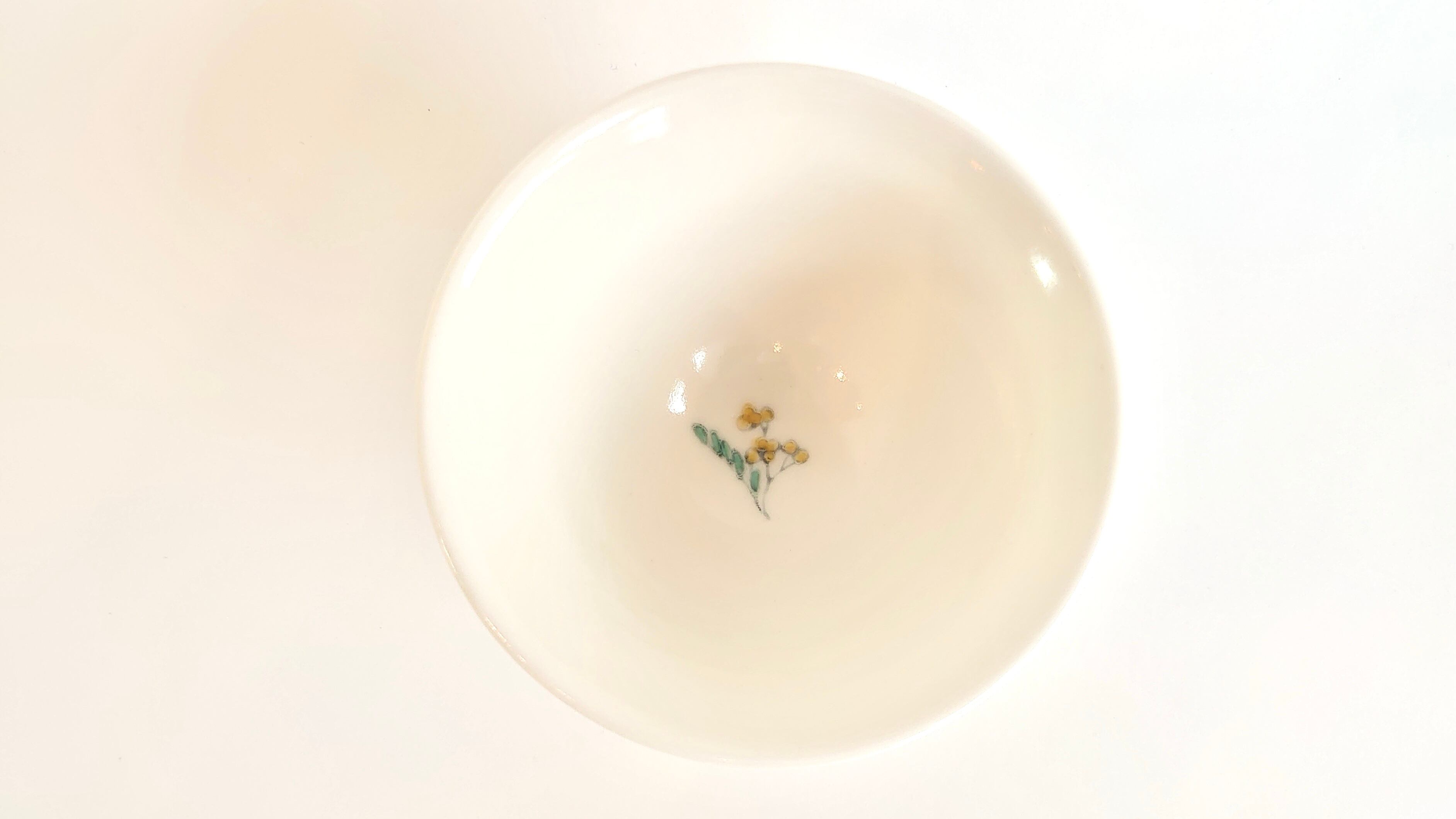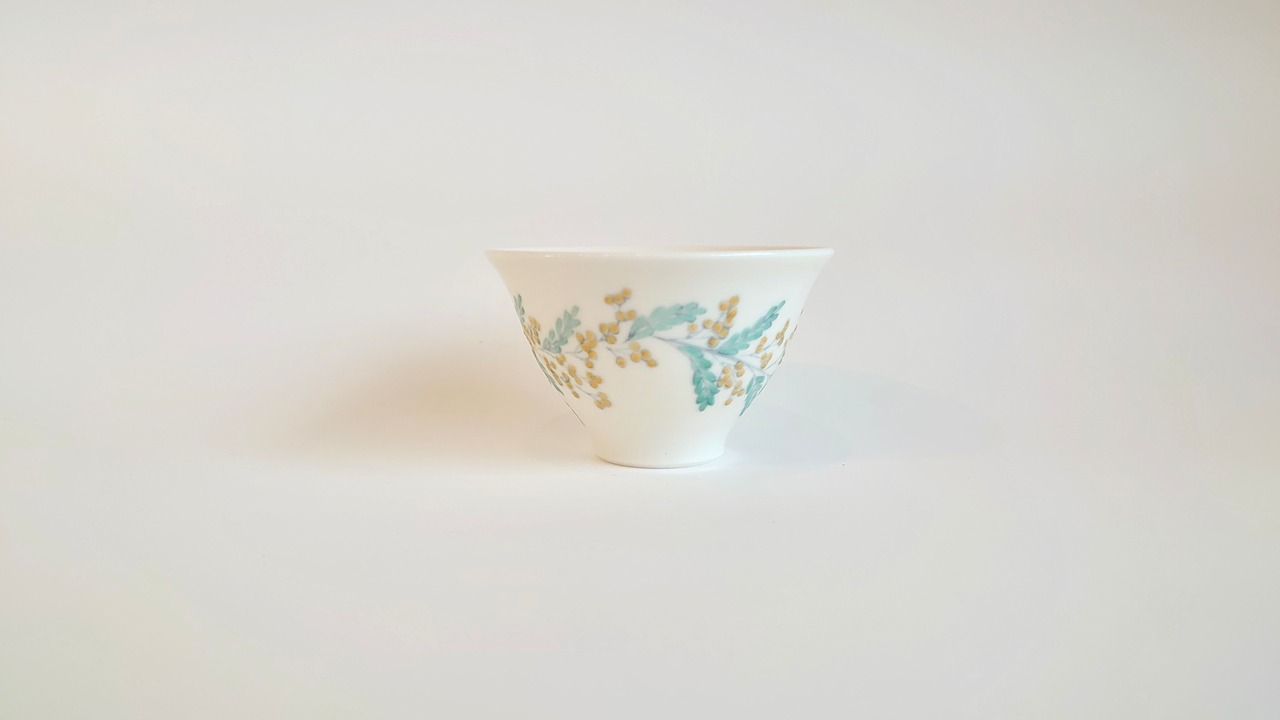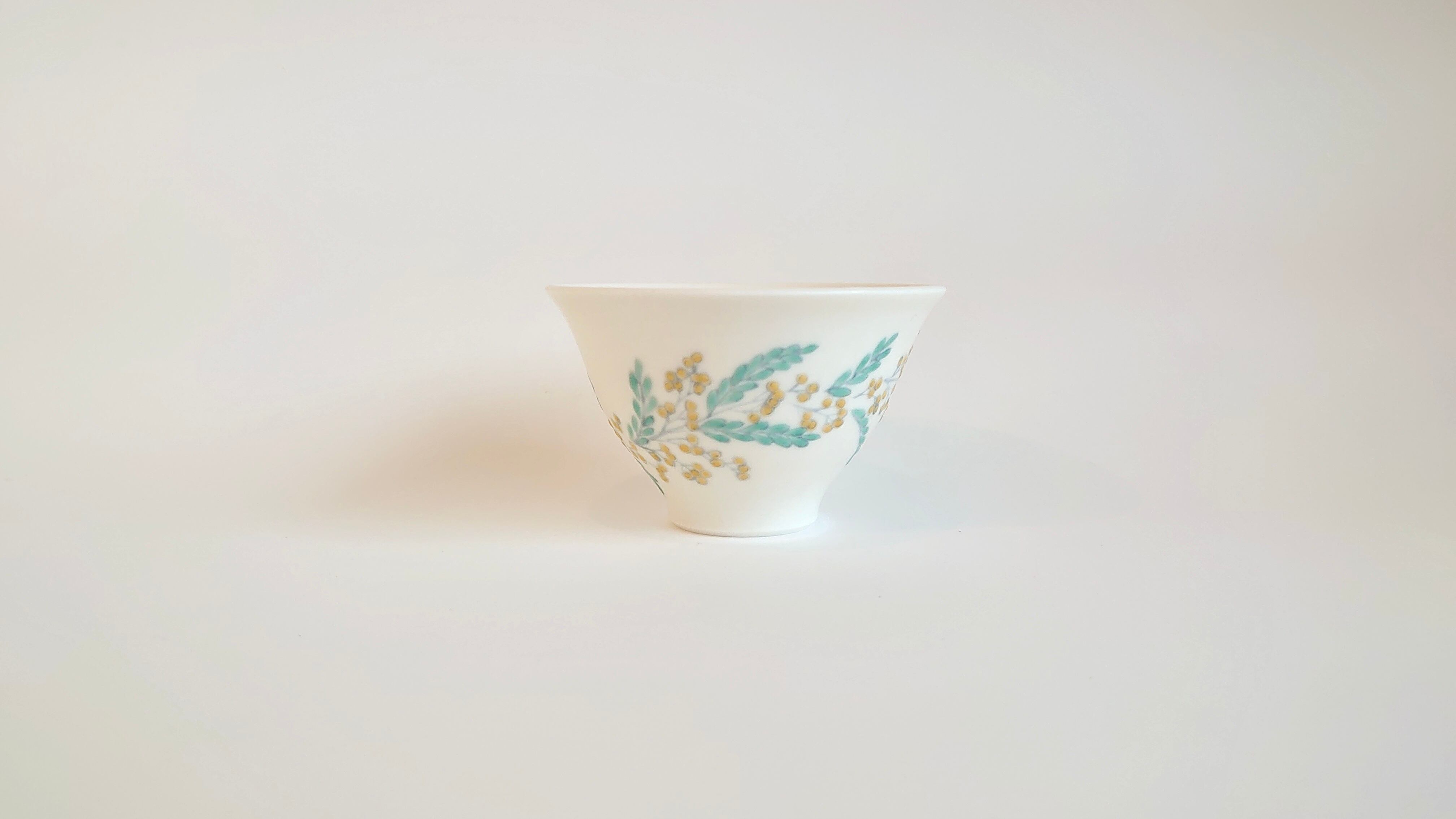 並べてみると揃いのものに見えますが、ひとつとして同じ文様はないミモザを施した盃です。