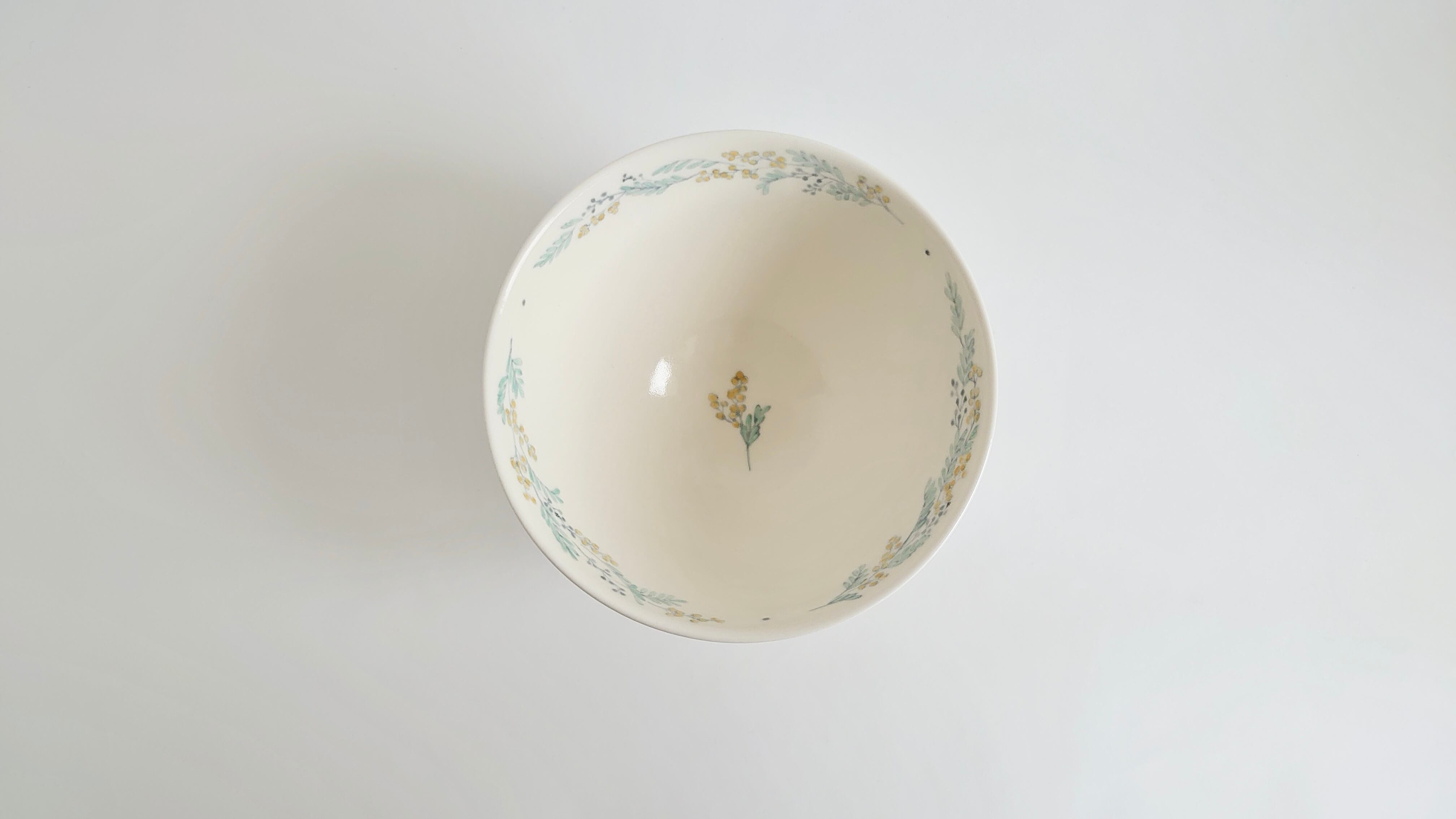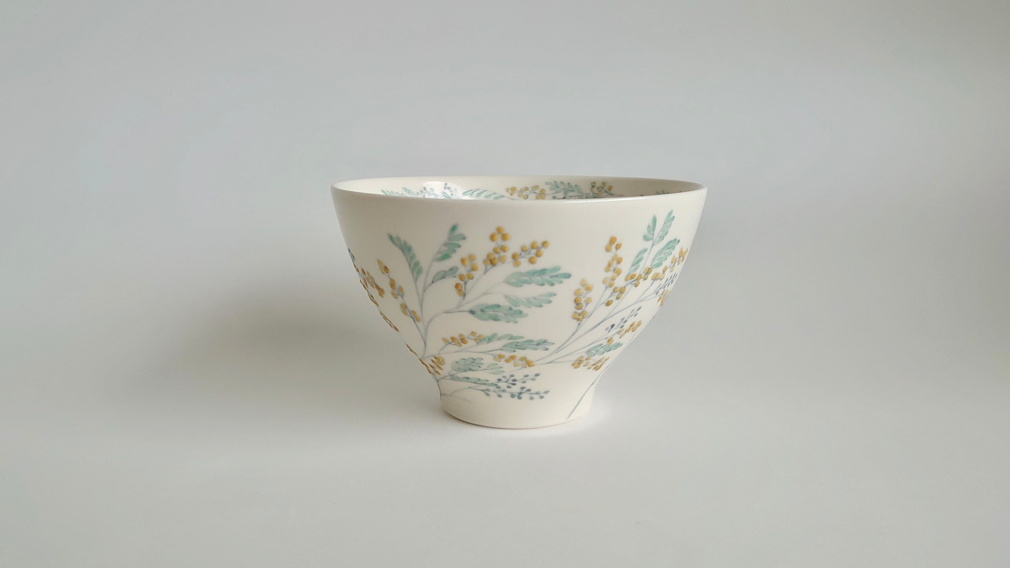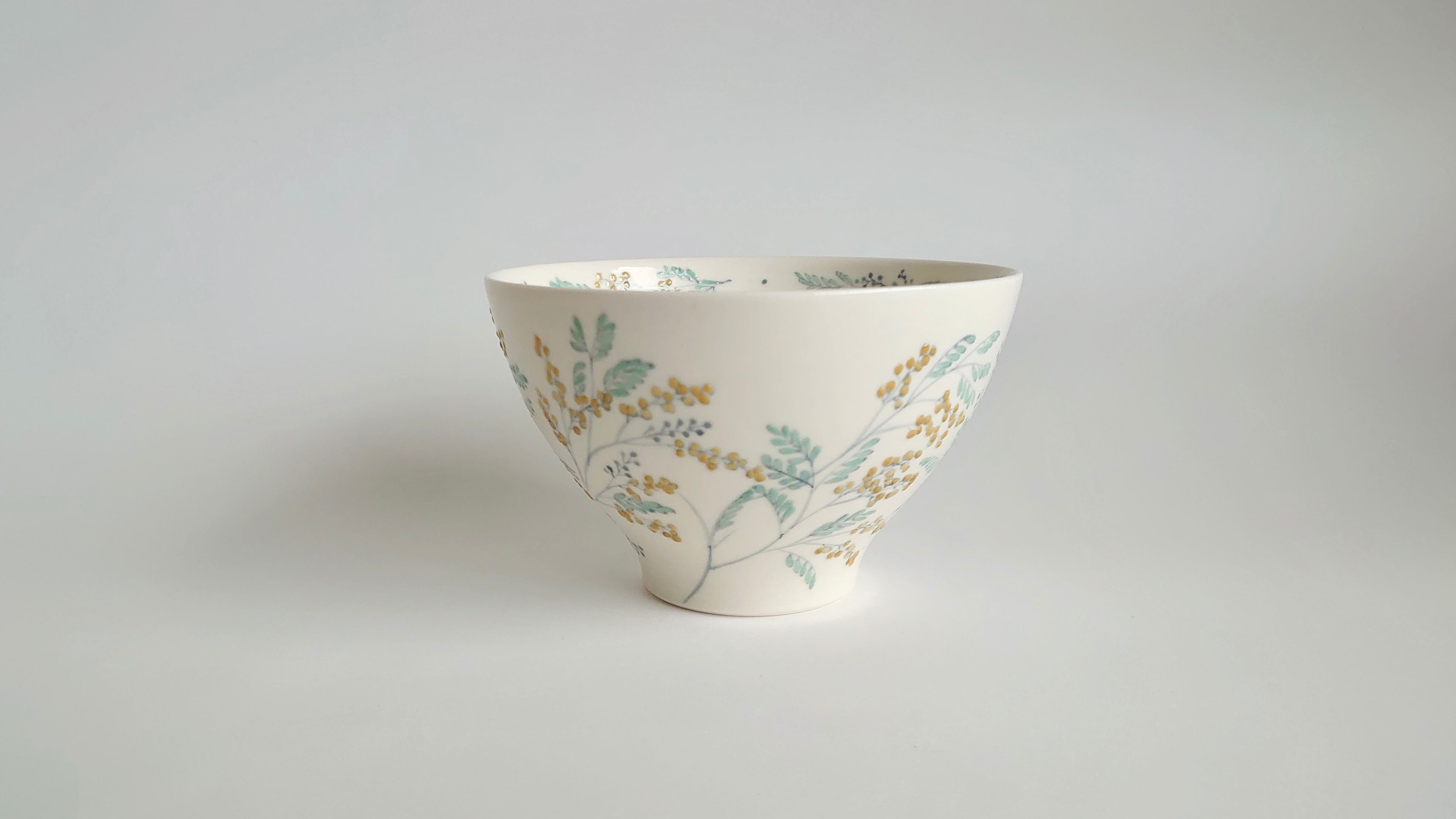 並べてみると揃いのものに見えますが、ひとつとして同じ文様はないミモザを施したうつわです。