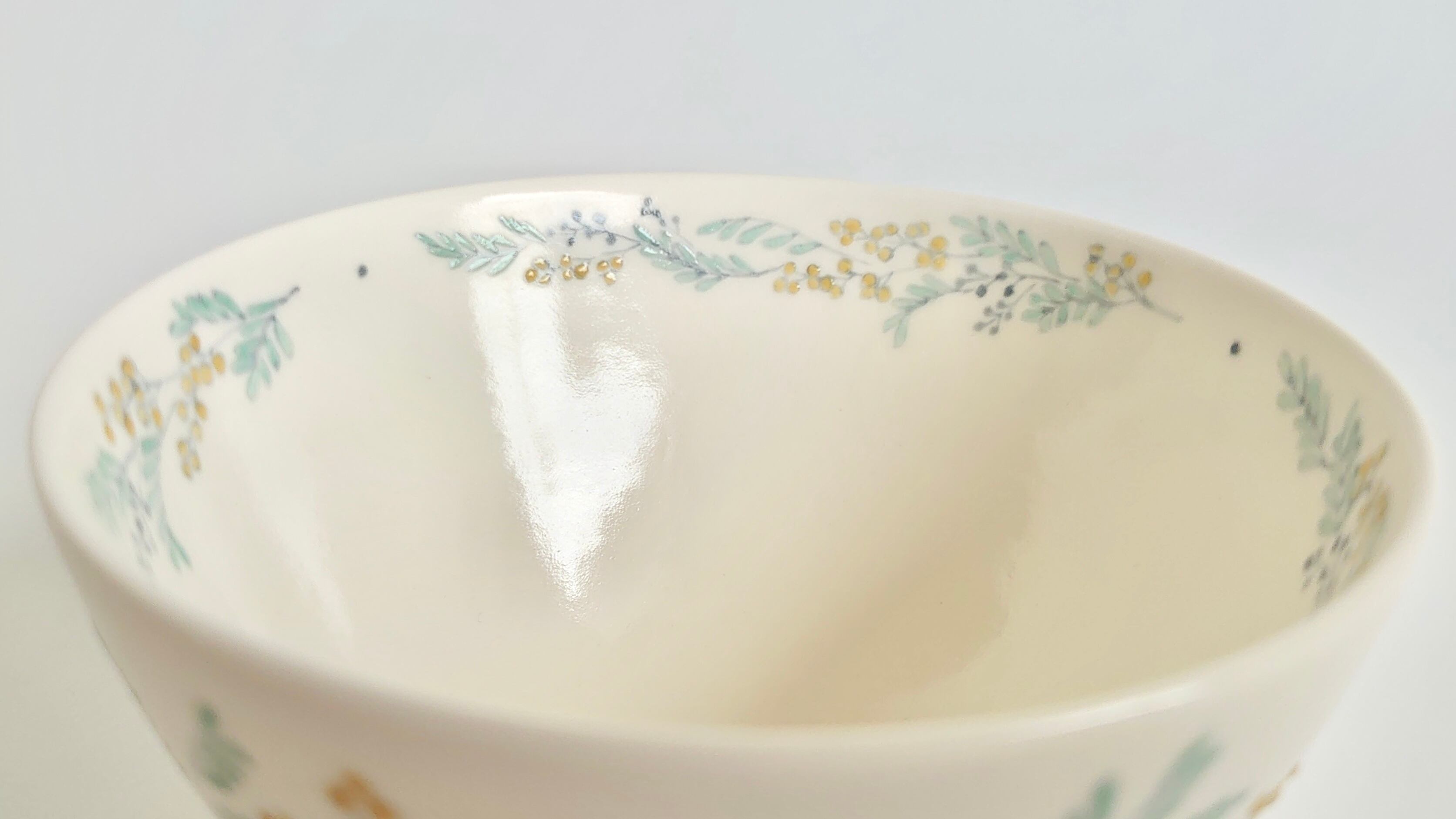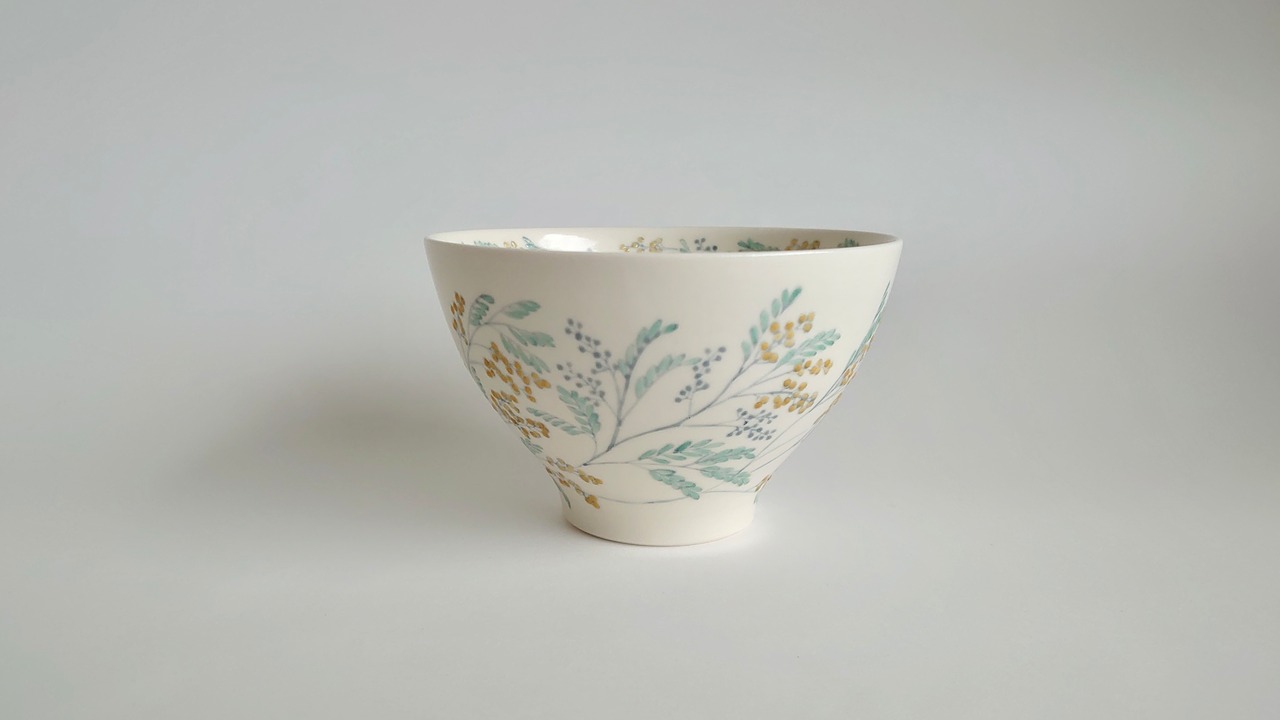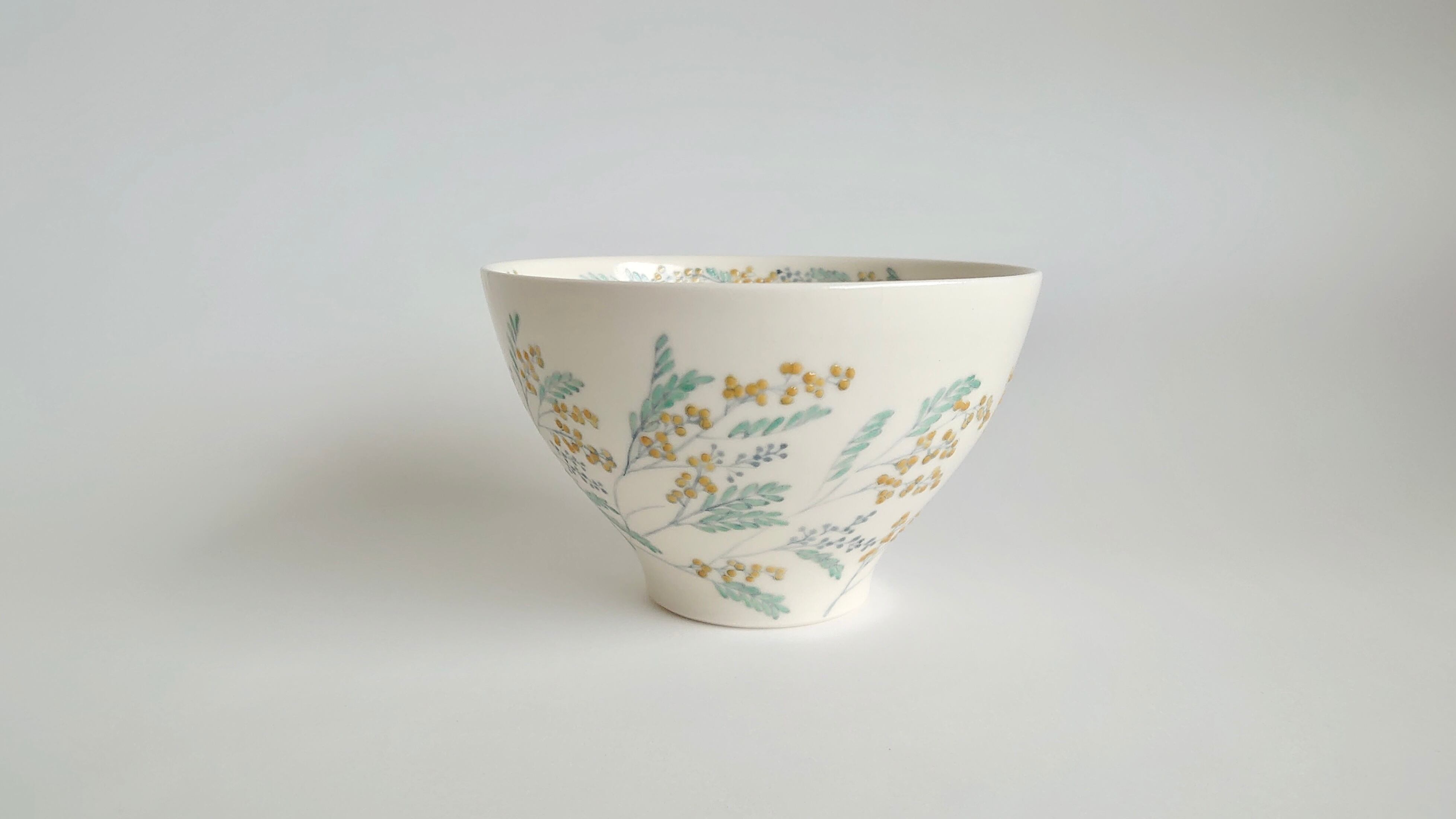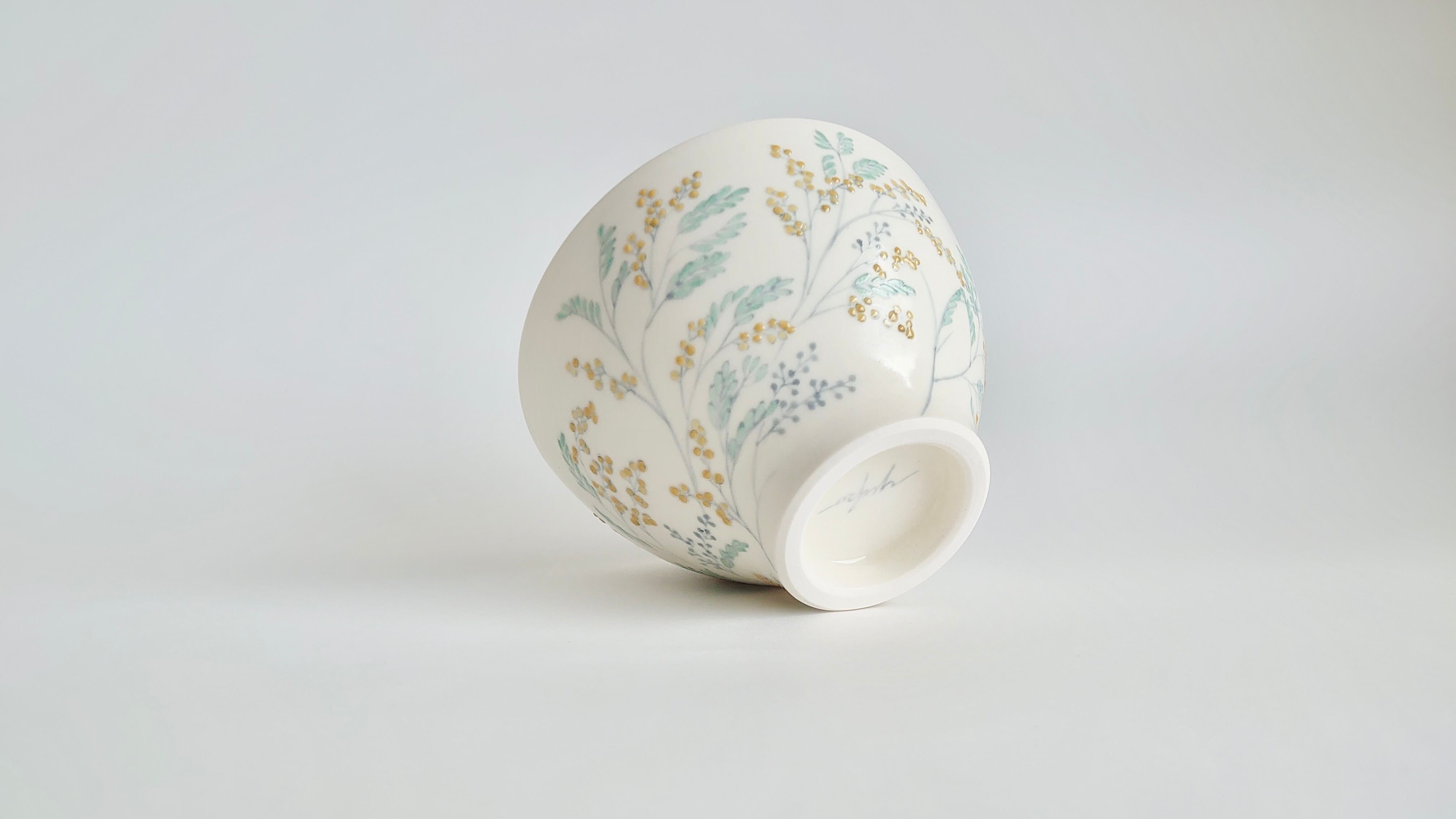 並べてみると揃いのものに見えますが、ひとつとして同じ文様はないミモザを施したうつわです。
